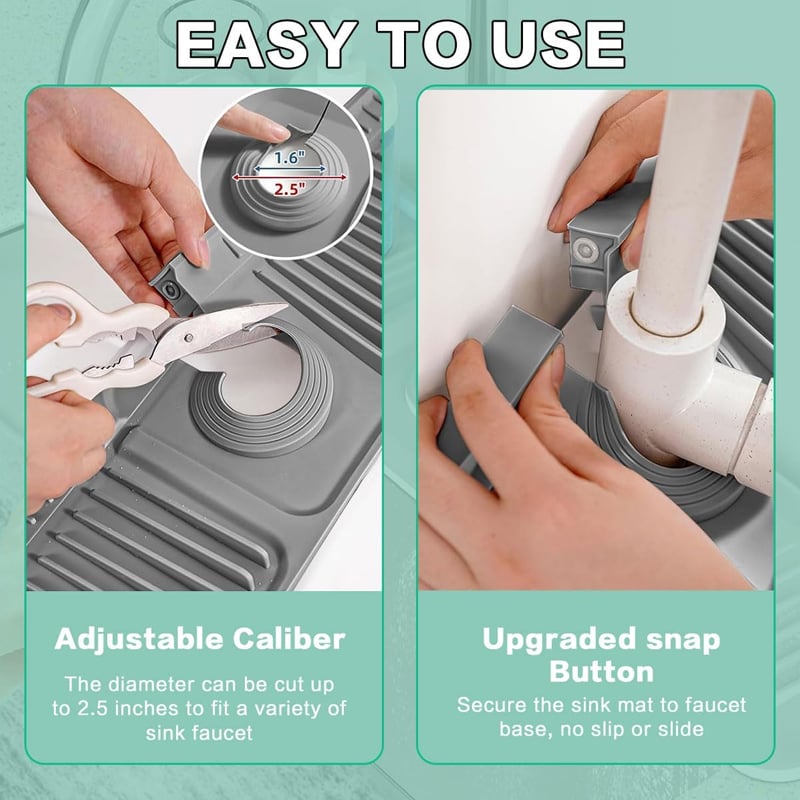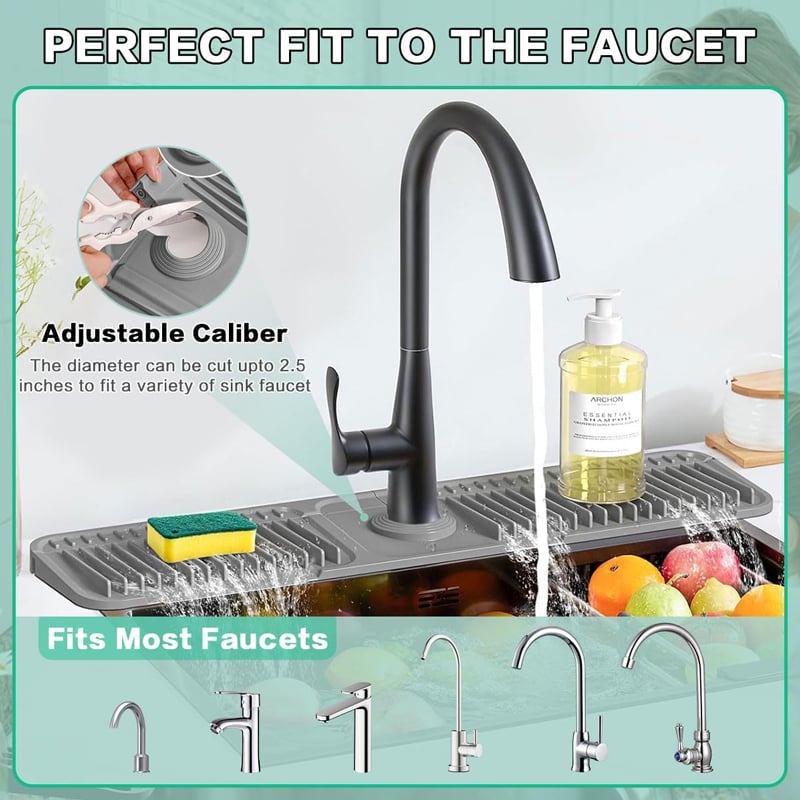 🚰Fit Most Faucets: You can freely cut to fit faucets with a diameter less than or equal to 2.5 inches, ensuring a snug and custom fit around your faucet, The kitchen faucet mat suitable for most sink faucets